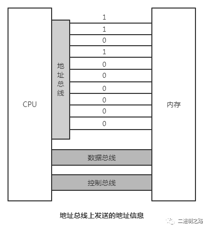 以下为具有10根地址总线的CPU,向内存发出地址信息为11(二进制为0000001011)时,10根地址线上传送的二进制信息。