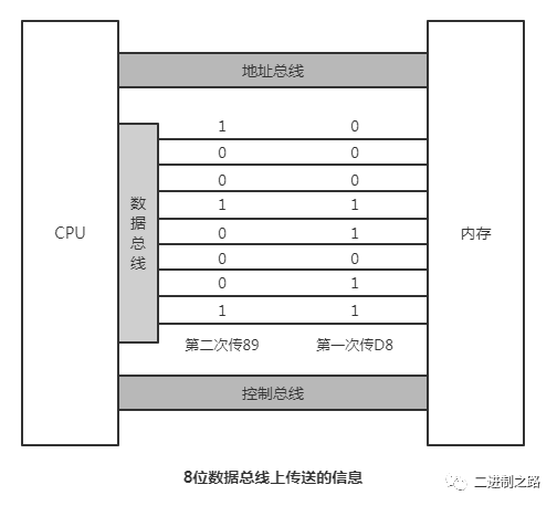 数据总线的宽度,决定了CPU和外界的数据传输速度。8根数据总线,一次可传输一个8位二进制数据。16根数据总线,一次可传输两个字节。