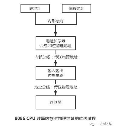 8086 CPU,在内部使用2个16位地址,合成一个20位的物理地址。 其中,一个为段地址,另一个为偏移地址。通过地址加法器,合成一个20位的物理地址。