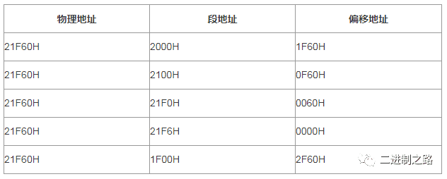 CPU可以用不同的段地址和偏移地址形成同一个物理地址。例如物理地址21F60H可以用如下段地址和偏移地址来表示: