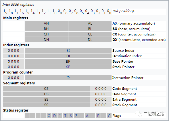 所有寄存器都是16位的,可以存放两个字节的数据。