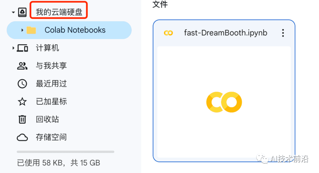 返回到云盘 https://drive.google.com/ (opens in a new tab) ,展开 我的云端硬盘 菜单,将会看到自动创建了Colab Notebooks目录,下面有一个我们刚刚保存的副本,名称为fast-DreamBooth.ipynb。 以后,我们就可以通过点击这个文件的名称,进入对应的环境了。