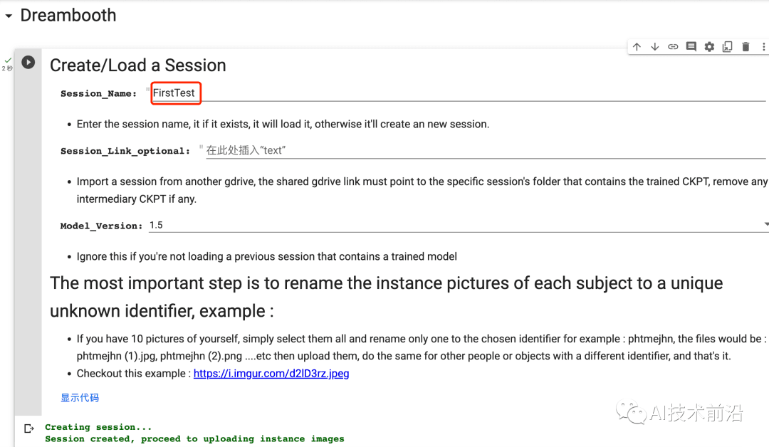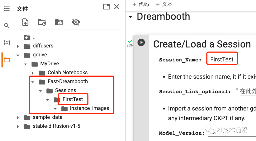 会话创建成功后,在Colab Notebooks的同级,增加了一个名为Fast-Dreambooth的目录。下一级是会话的父目录Sessions,然后FirstTest就是我们刚刚创建的会话对应的目录。而instance_images,用于存放我们要拿来作为训练输入的图片集。