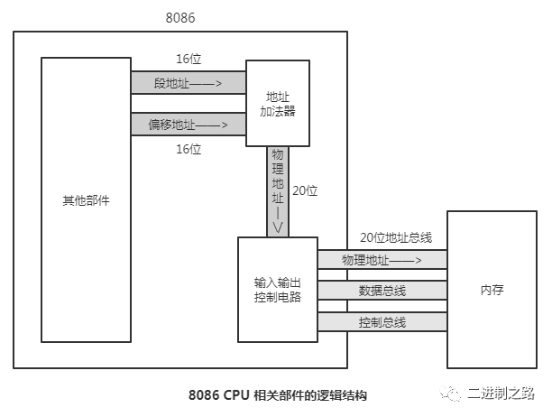 8086 CPU,在内部使用2个16位地址,合成一个20位的物理地址。 其中,一个为段地址,另一个为偏移地址。通过地址加法器,合成一个20位的物理地址。